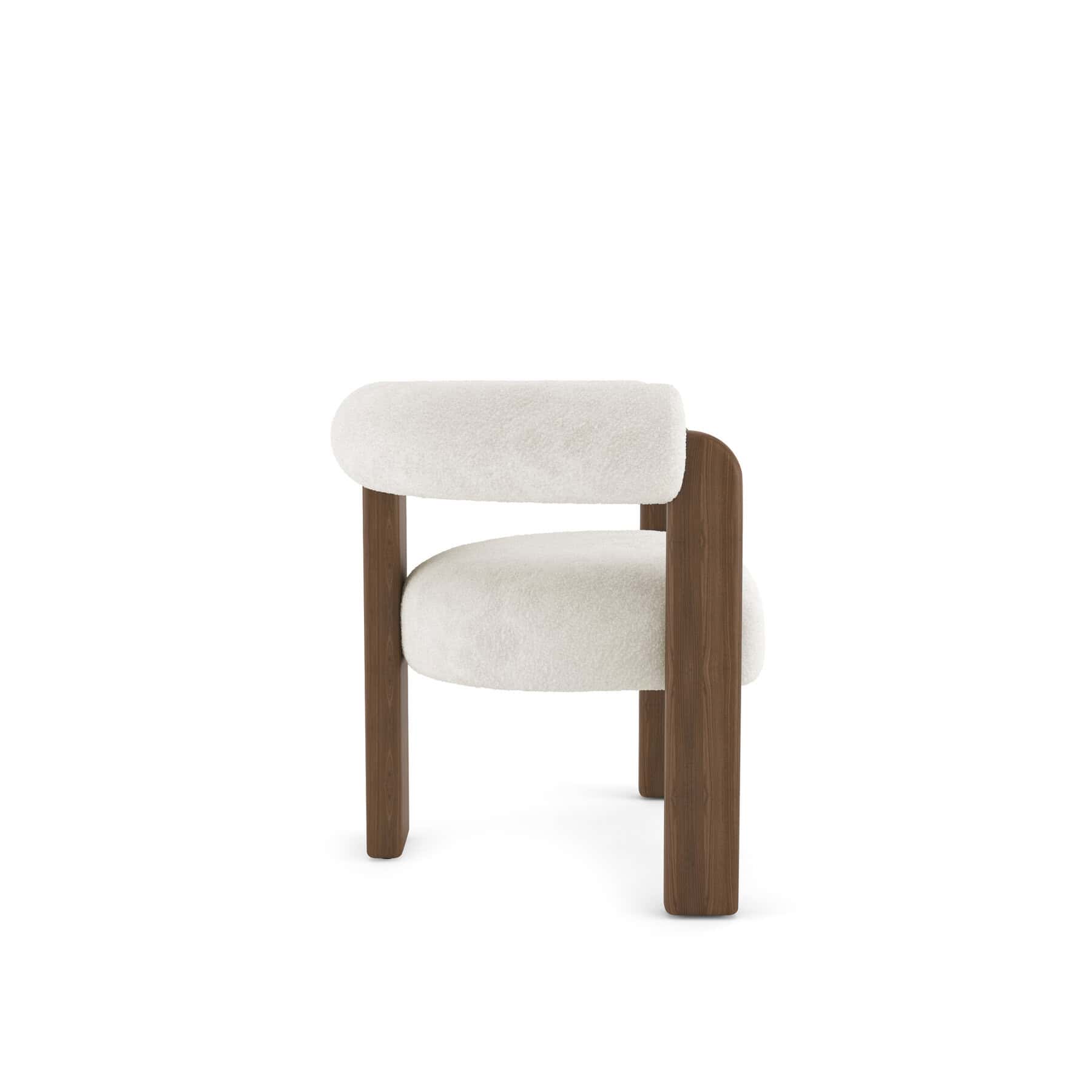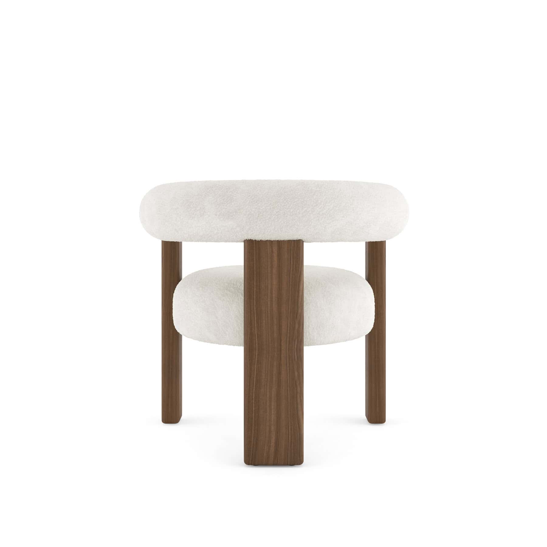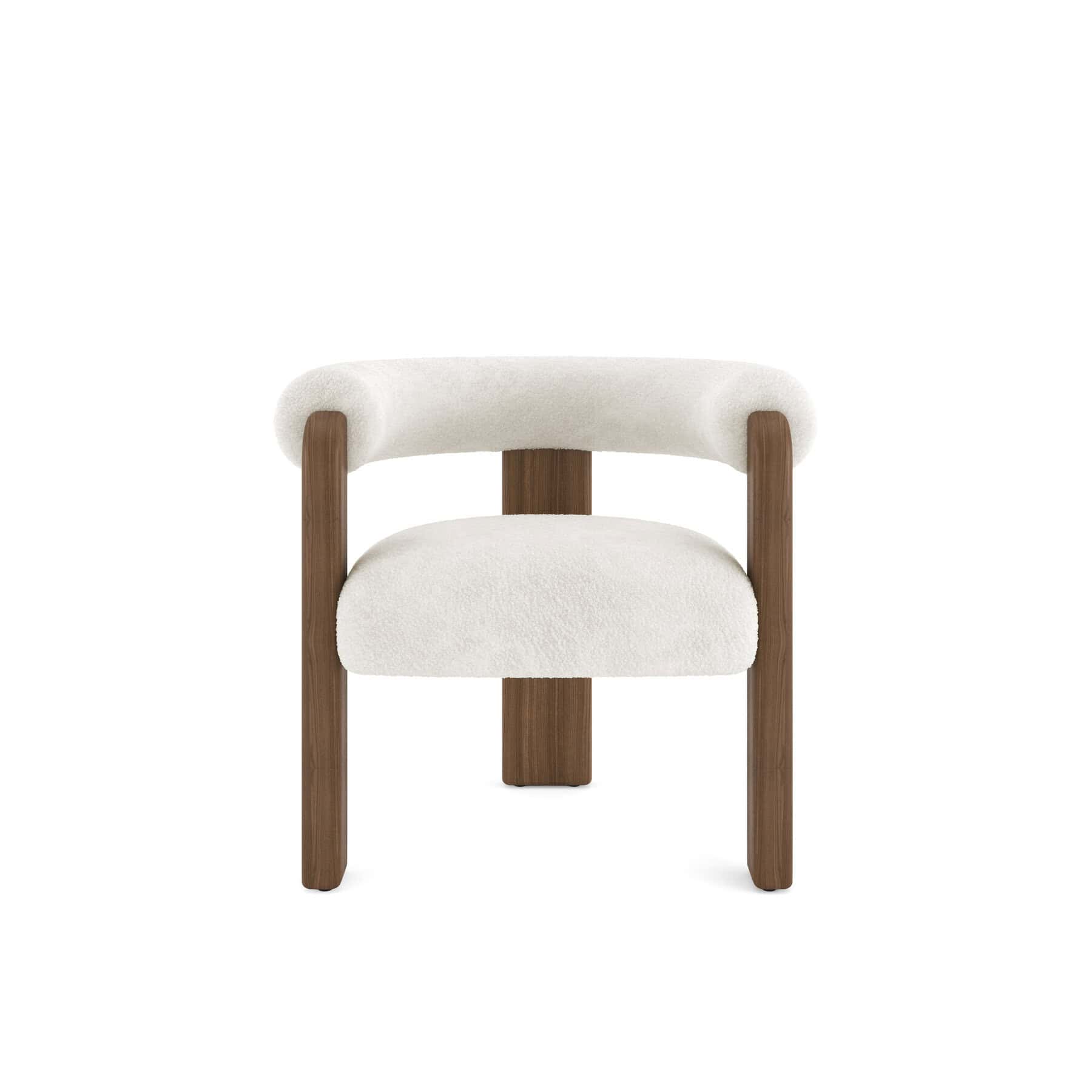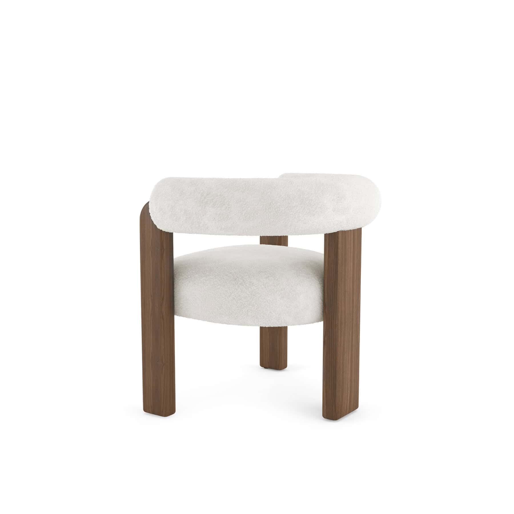 The Auro armchair has a curved-back design with an ash wood frame, supported by a tripod-like, three-legged structure.