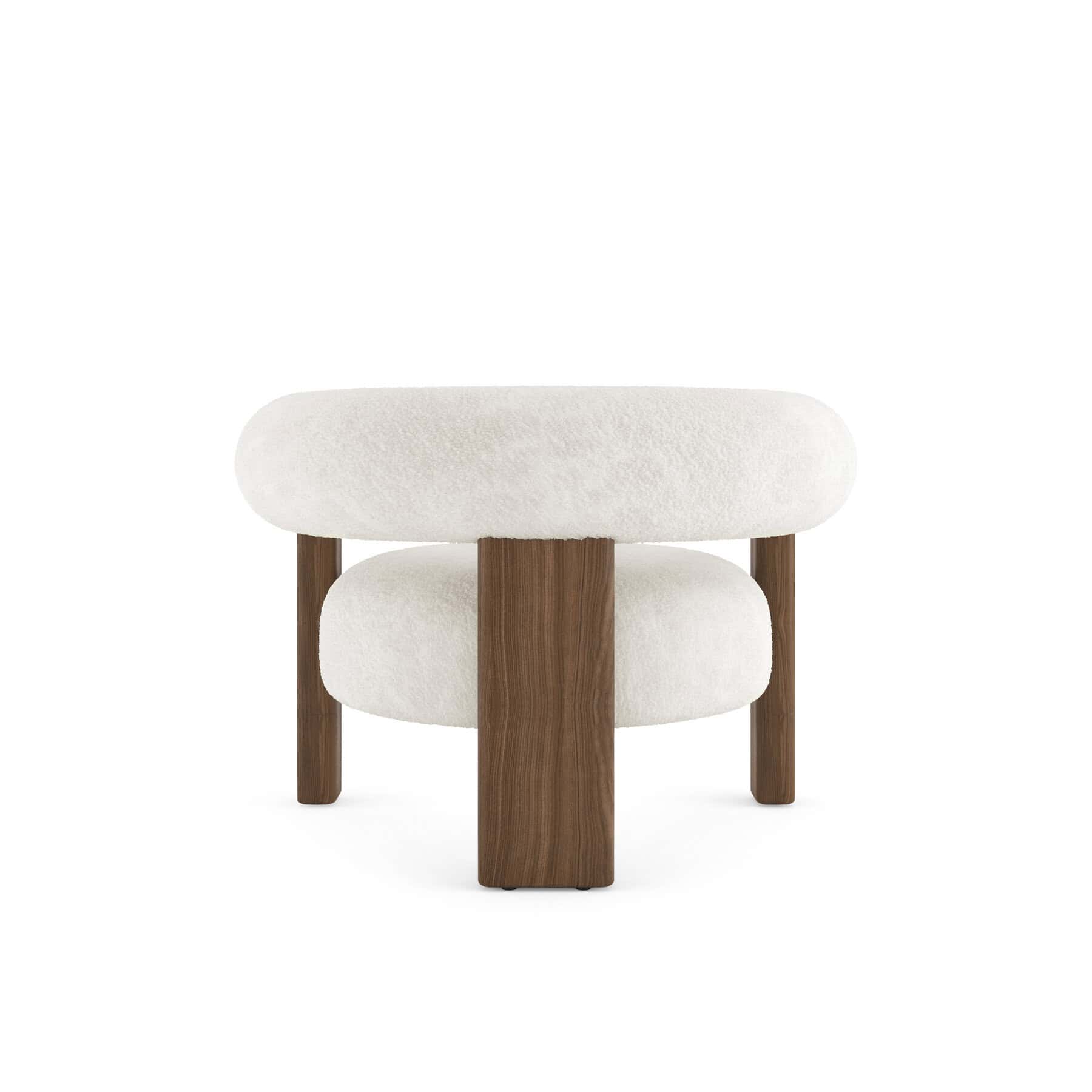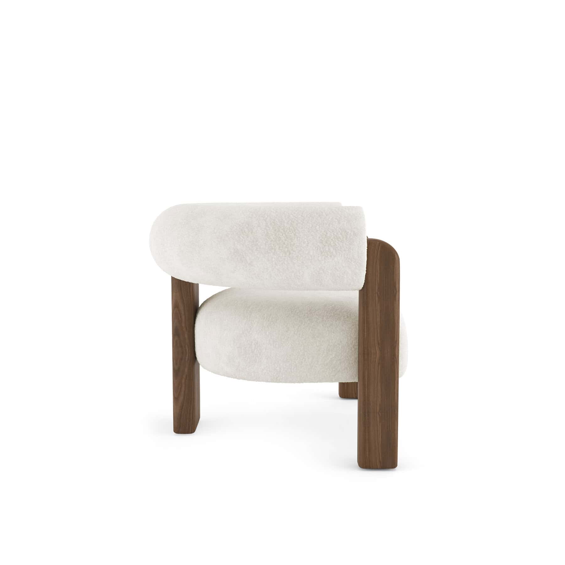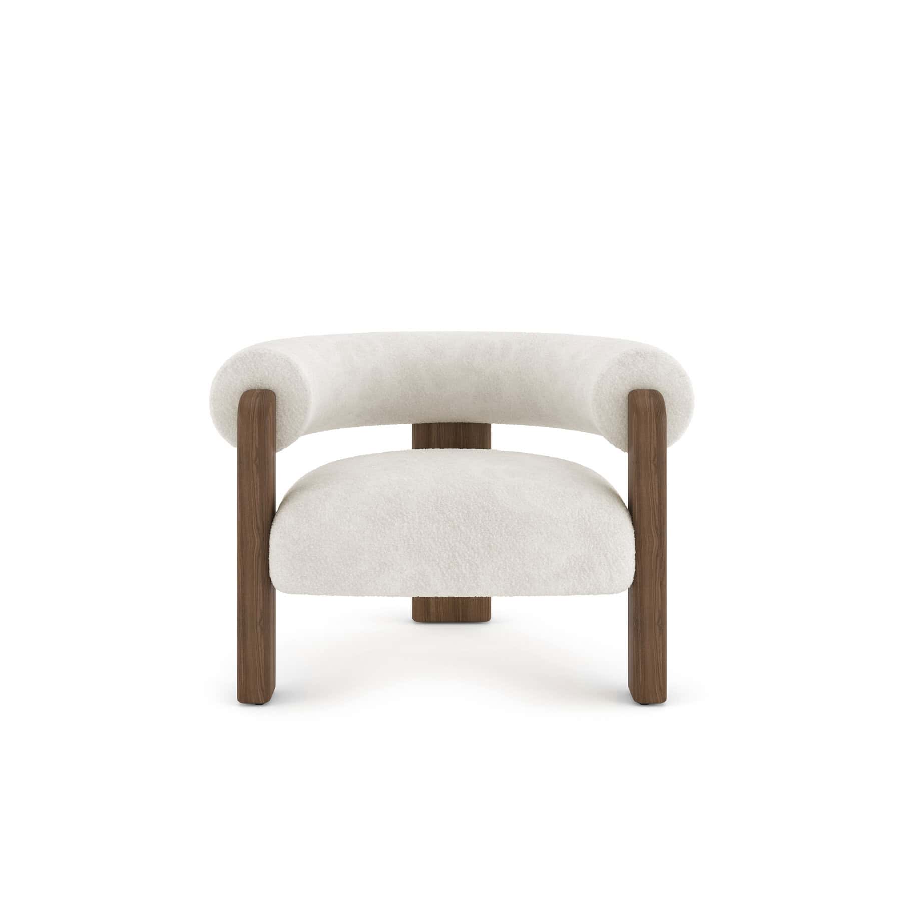 The Auro lounge chair has a curved-back design with an ash wood frame, supported by a tripod-like, three-legged structure.