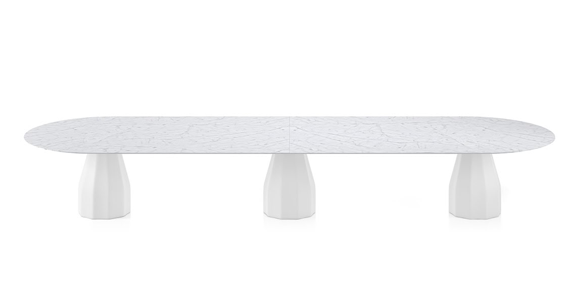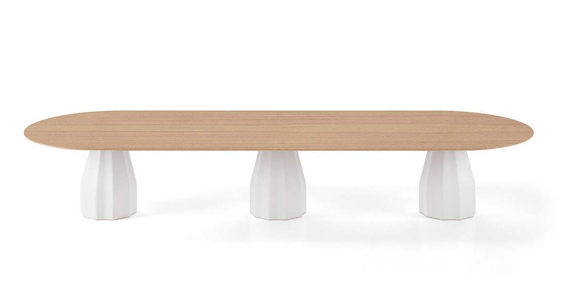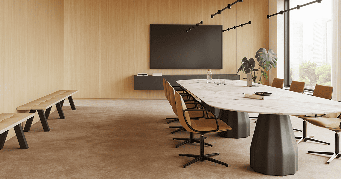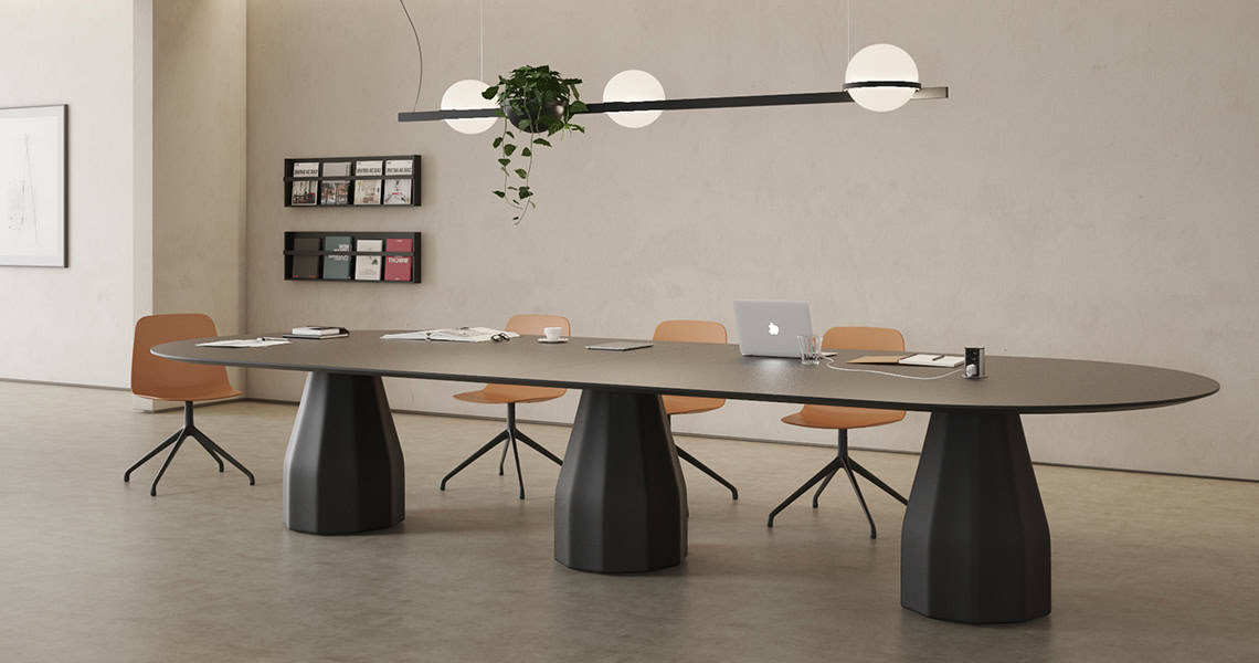 The Burin meeting table has a single tabletop available in multiple materials & finishes, & three metal bases also available in different finishes.