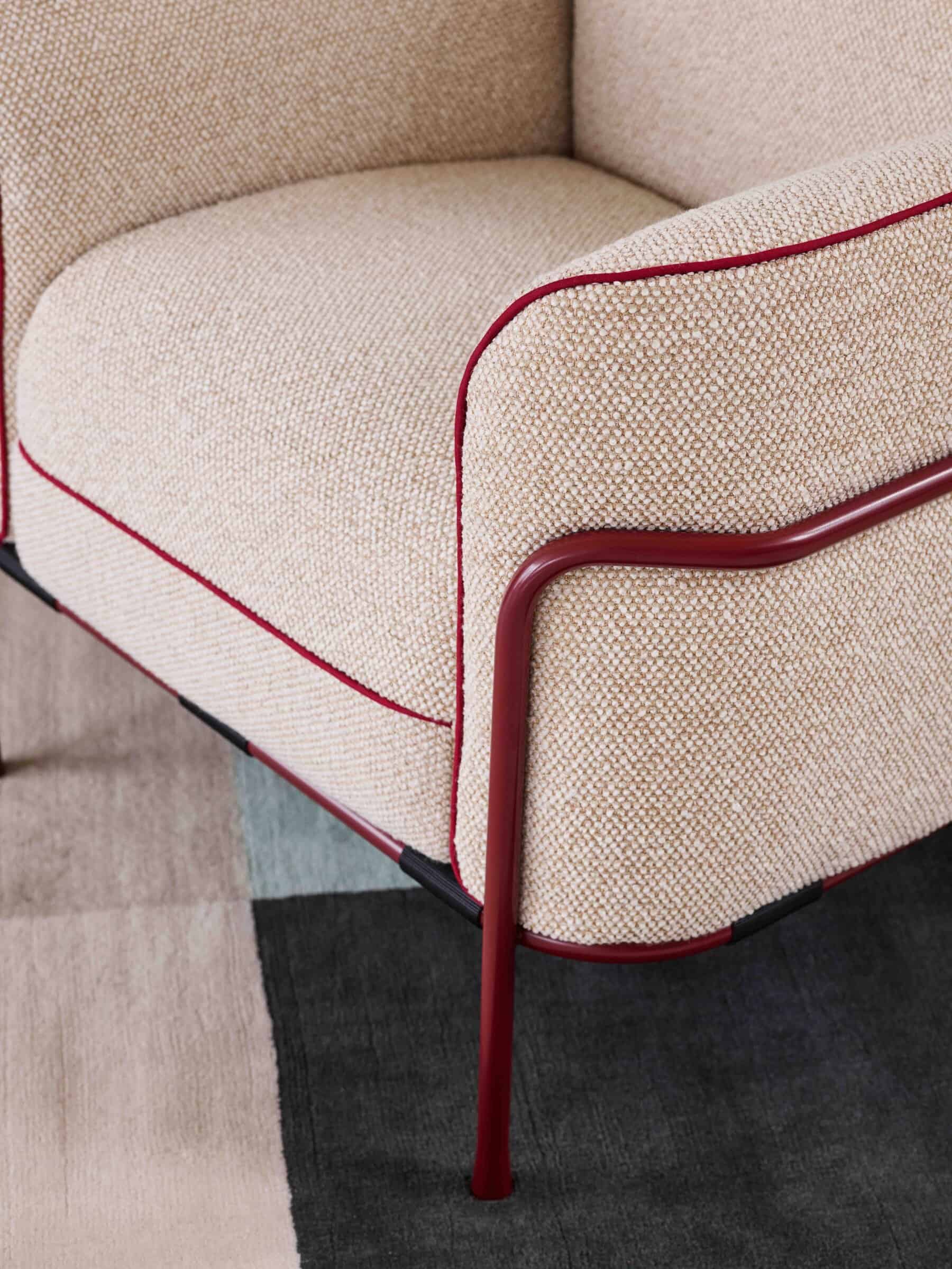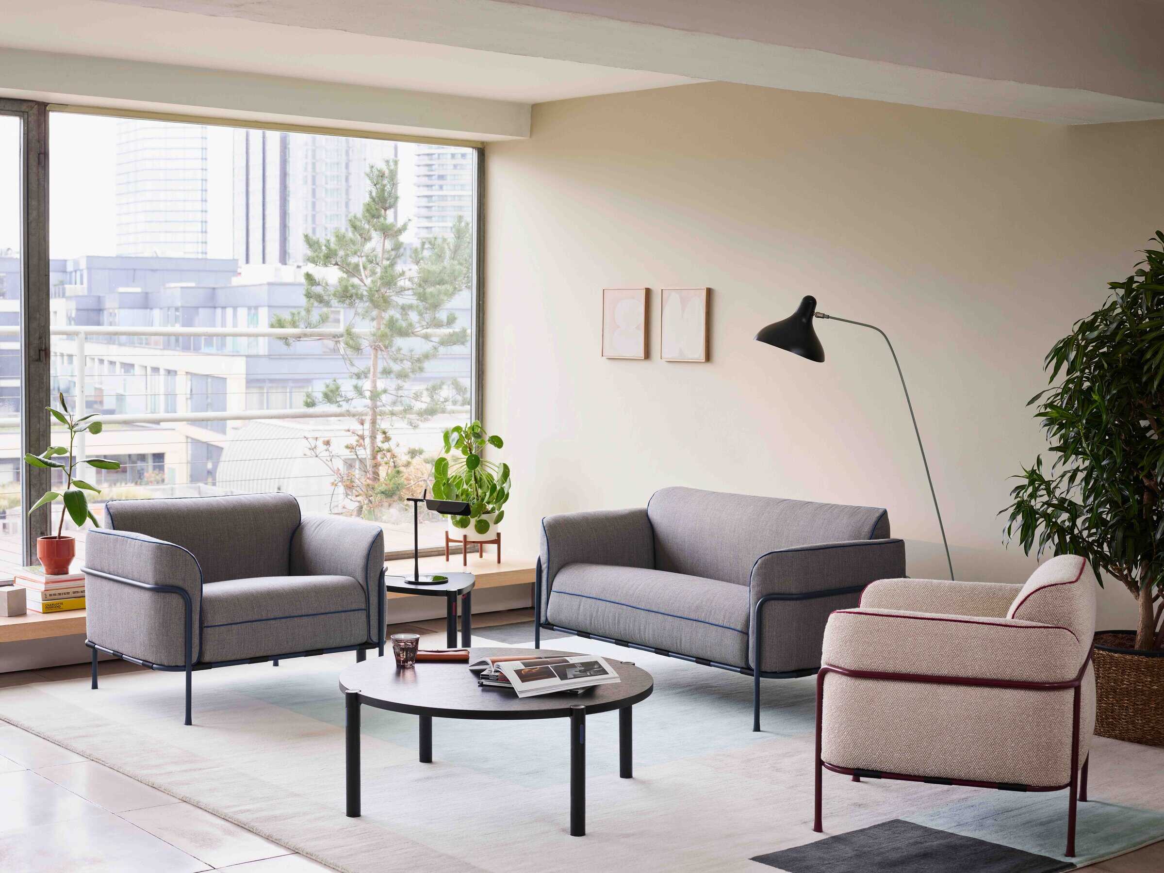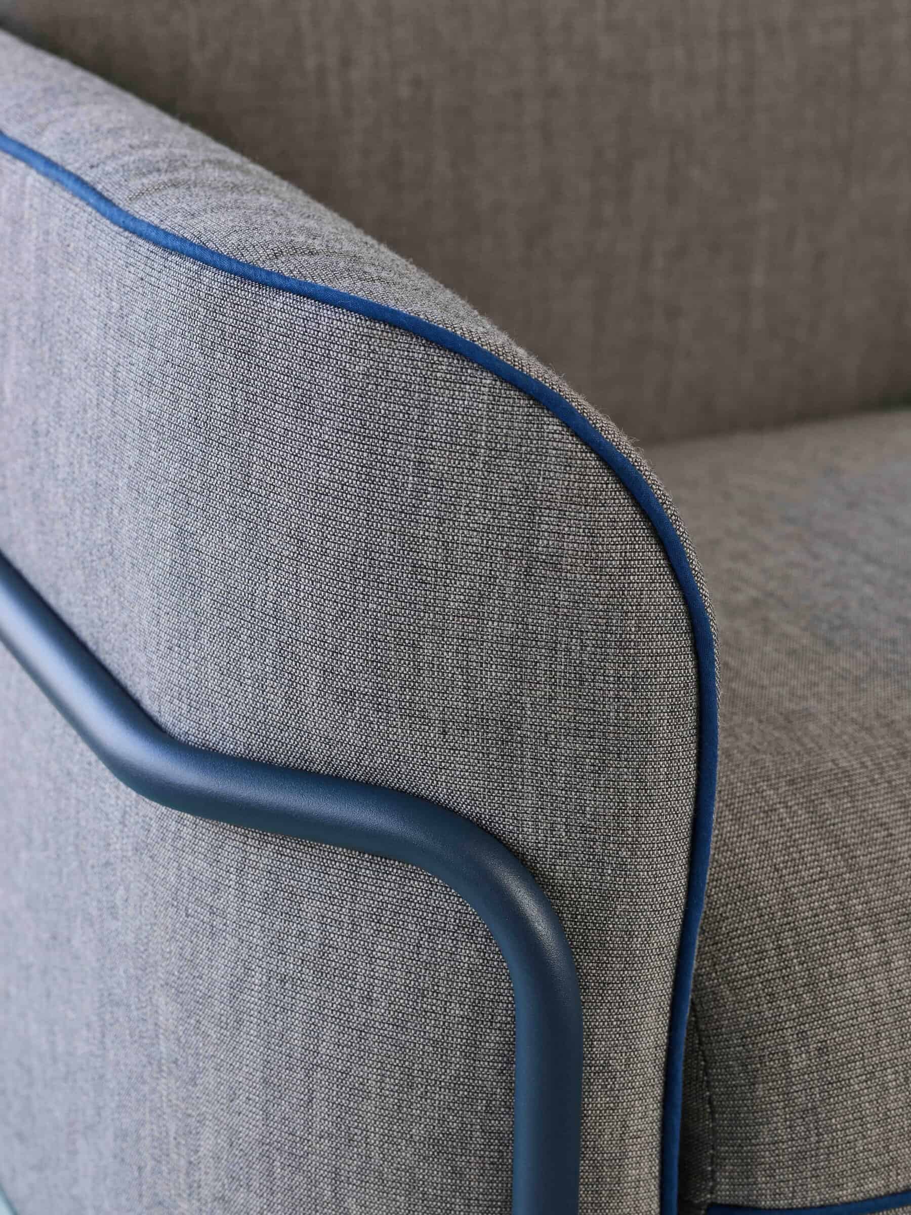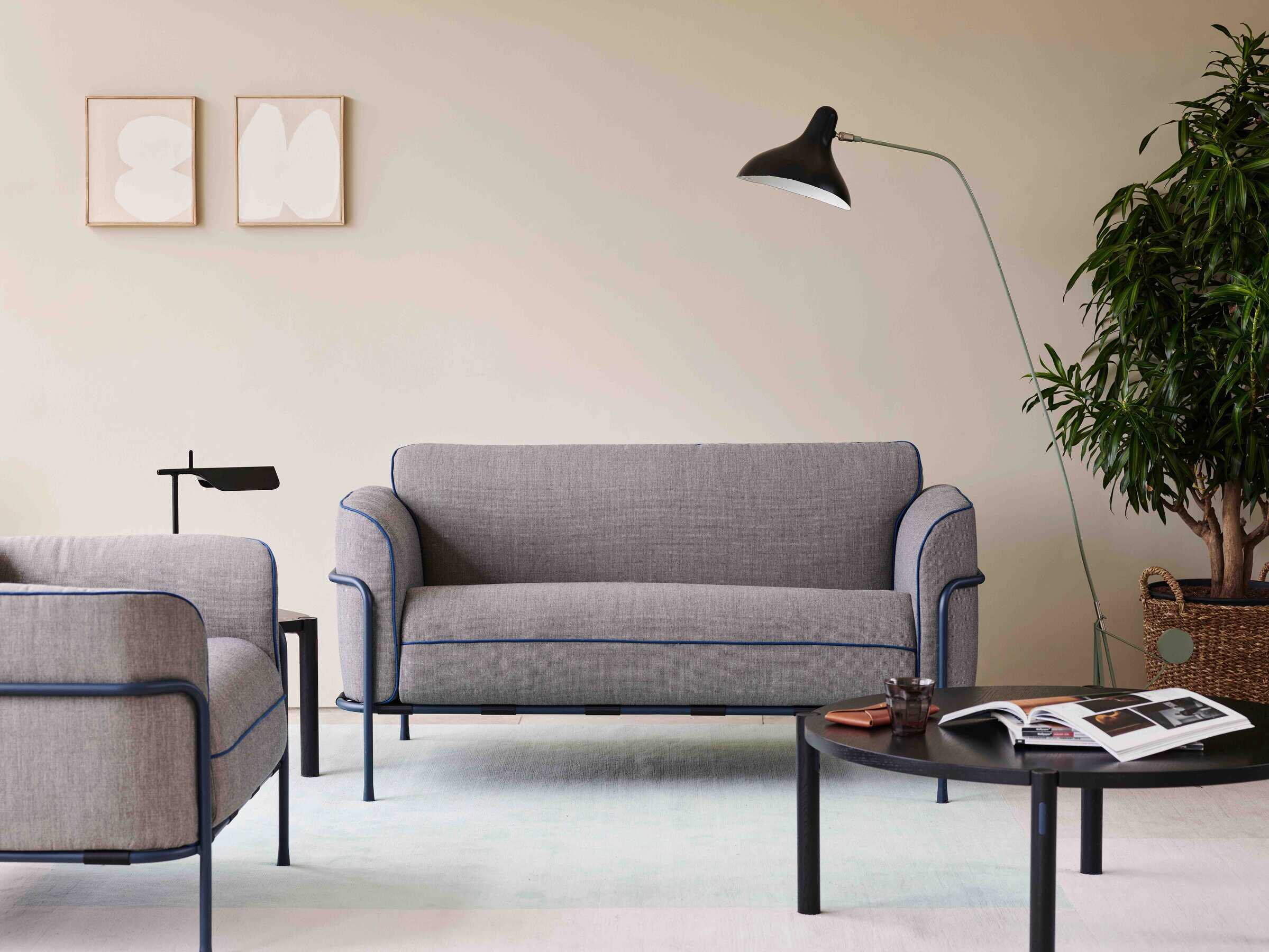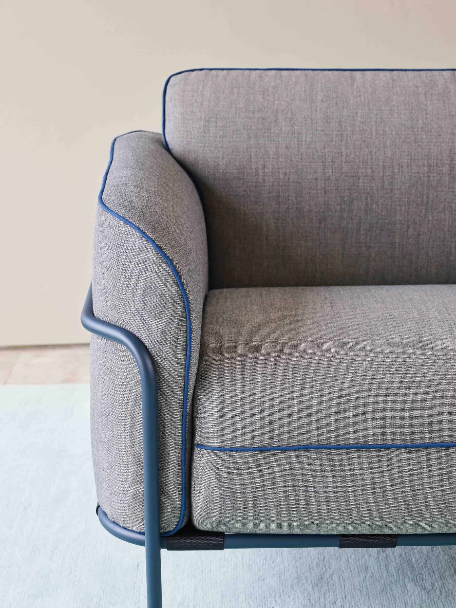 The Clara sofa comes in a huge range of fabrics with a contrasting or complementing steel frame in five colours with matching piping.