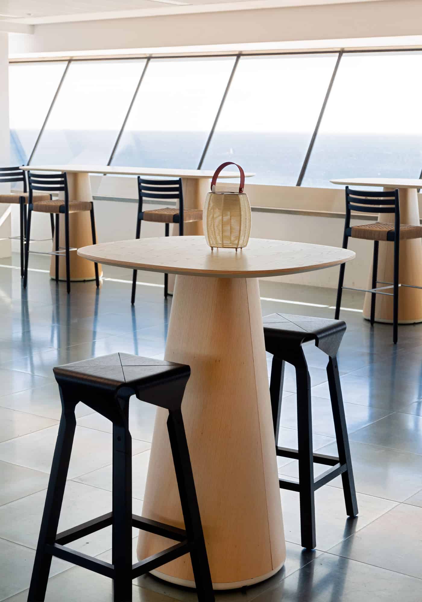 The Conic high table has a double base, poseur height ash frame & oval plywood top.