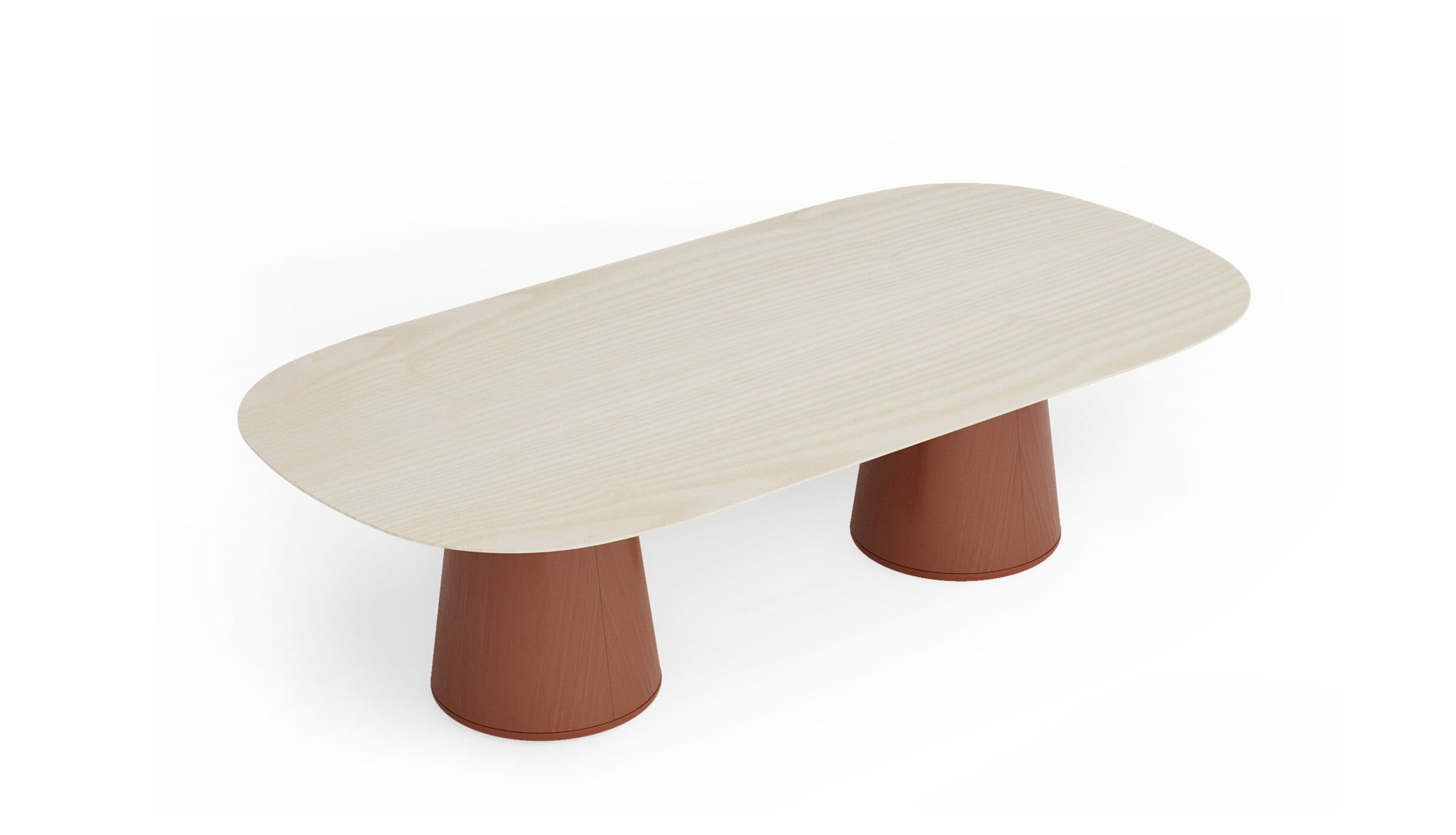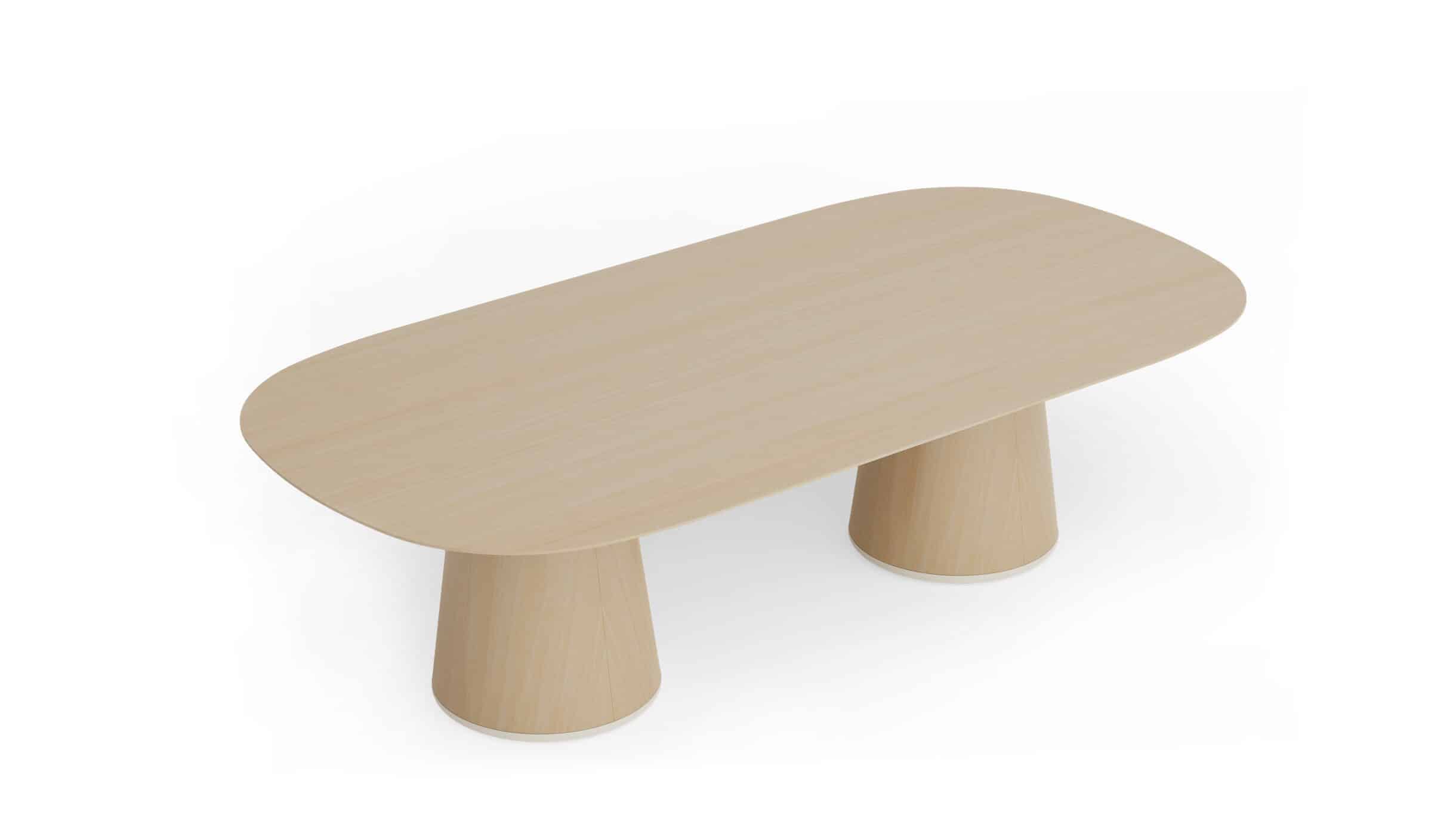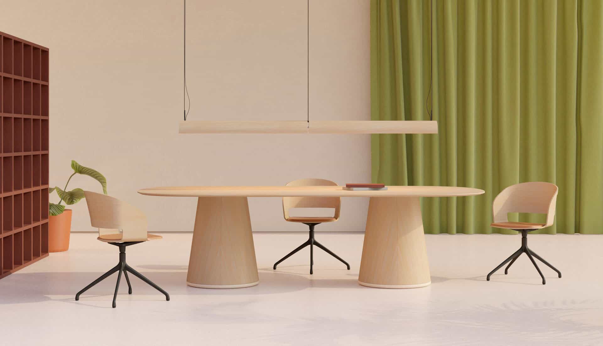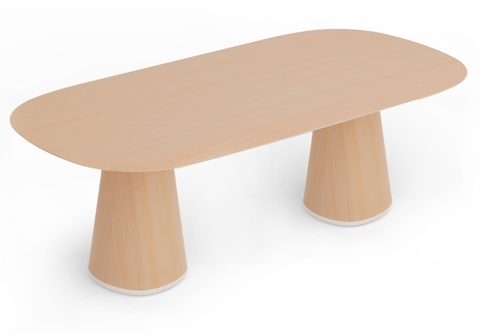 The Conic meeting table has a double base, ash frame & oval plywood top.