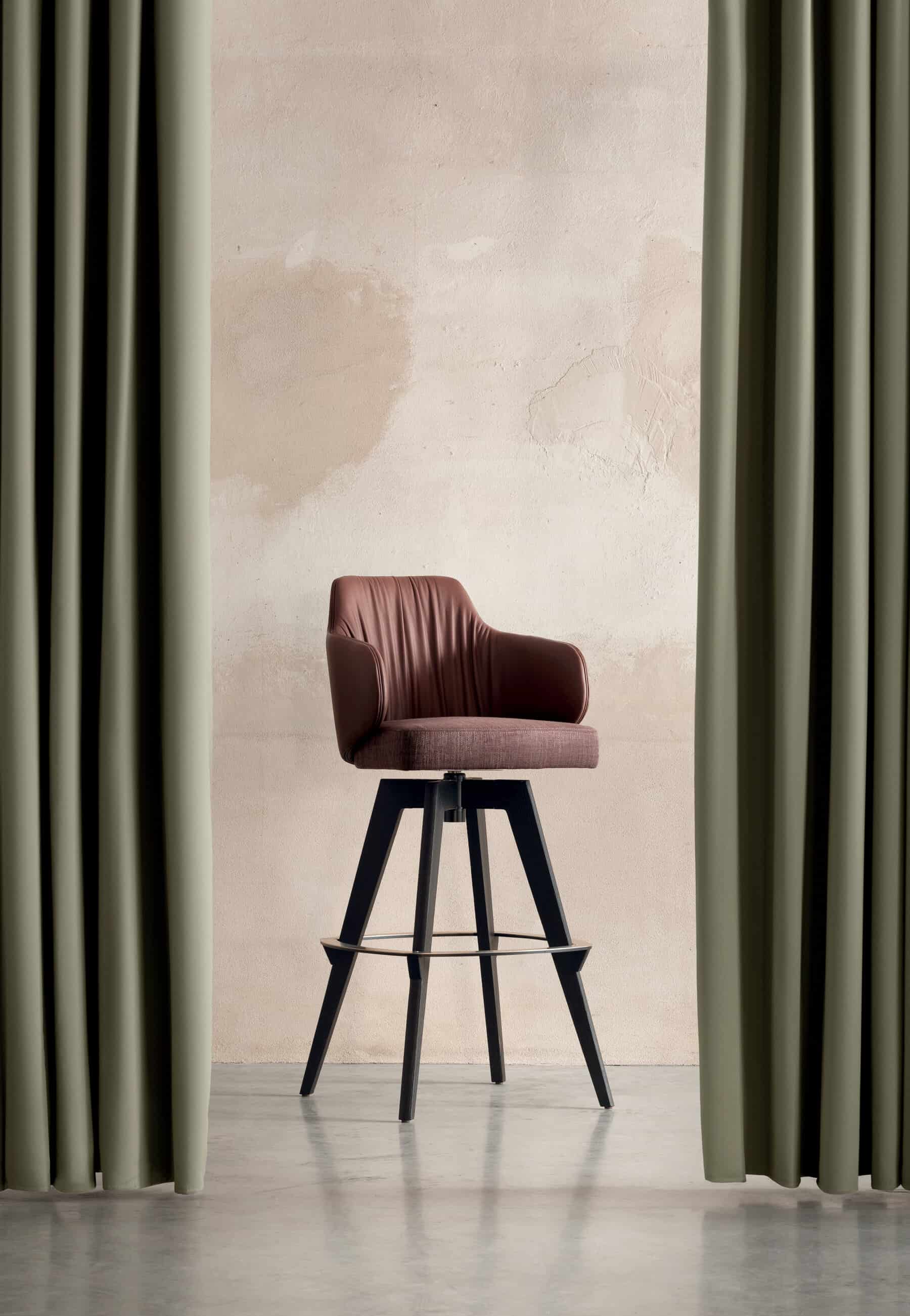 The Mia high stool has a solid ash frame with an upholstered seat and back, & swivel base.
