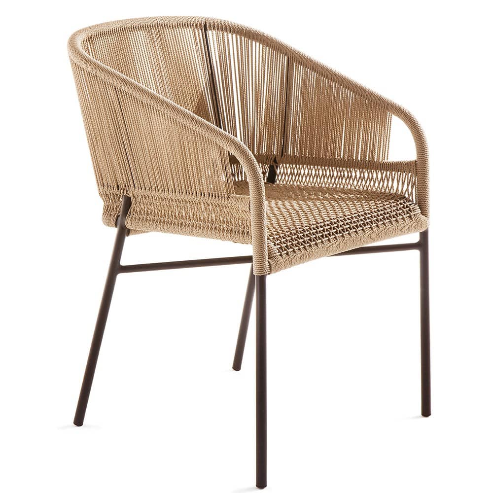 The Ocean Dining Chair has a powder coated metal frame with matching rope detail, available in taupe, dark grey, or dark green.