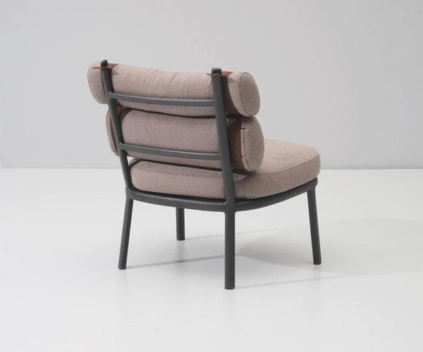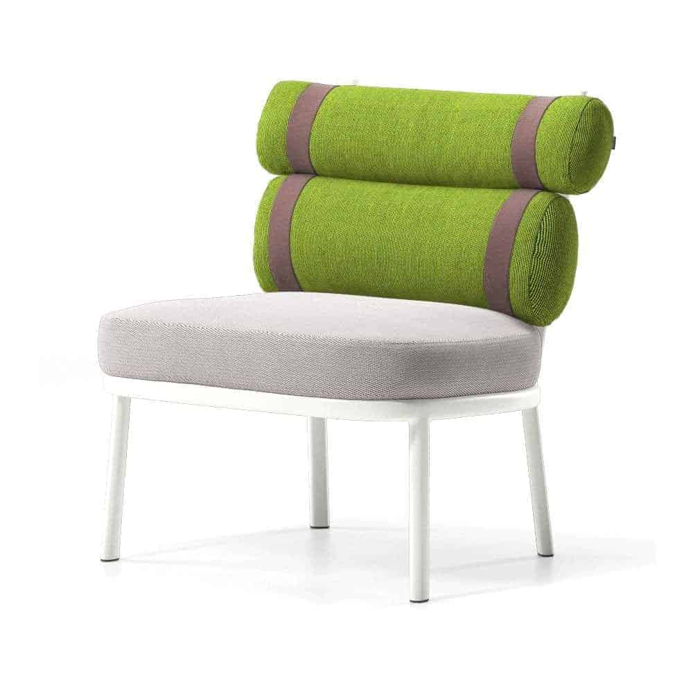 The Roll Lounge Chair has a metal frame finished in a wide range of colours, with bolster-like upholstered cushions.