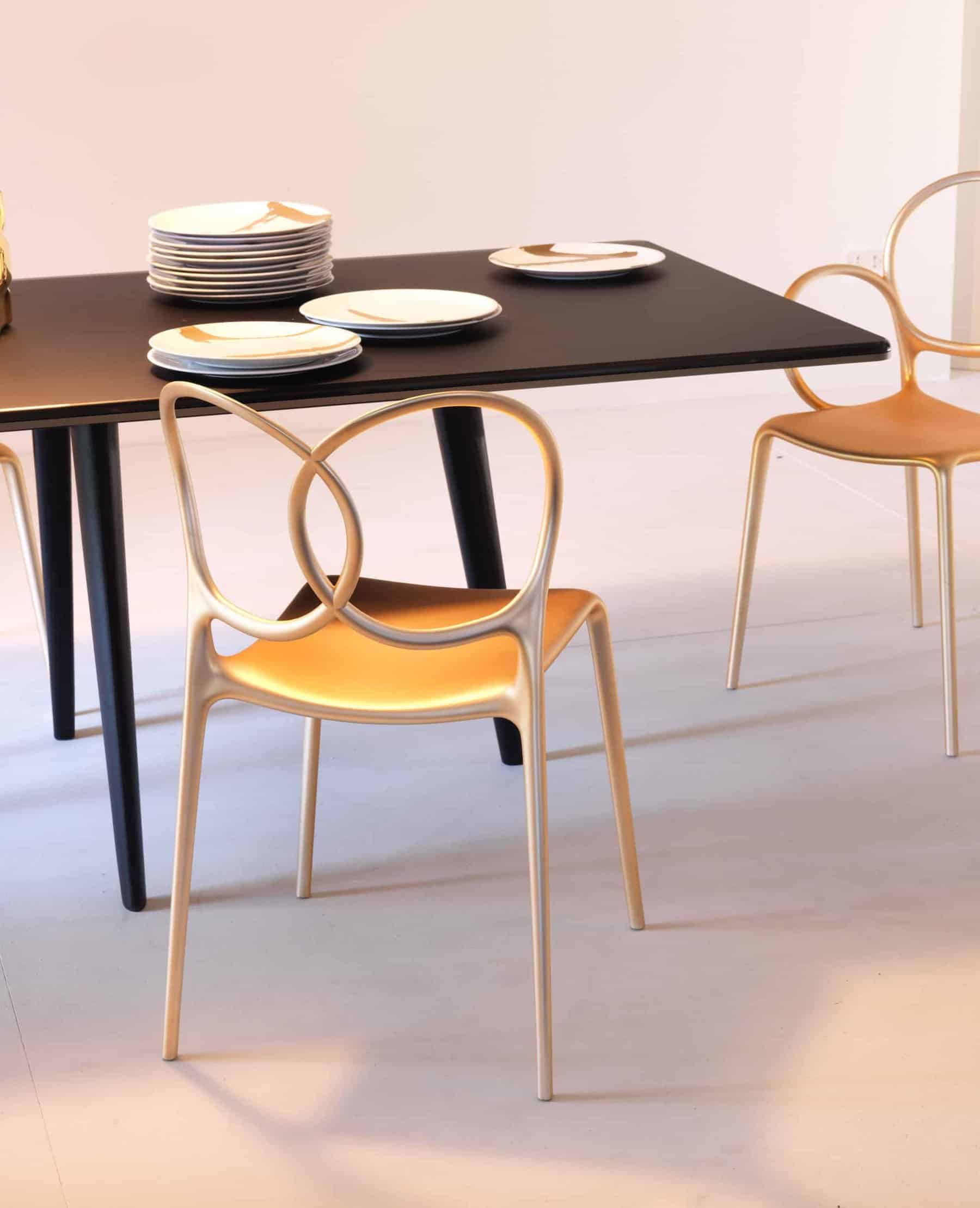 The Sissi Armchair has a stackable frame made from 100% recycled plastic, available in a range of colours.