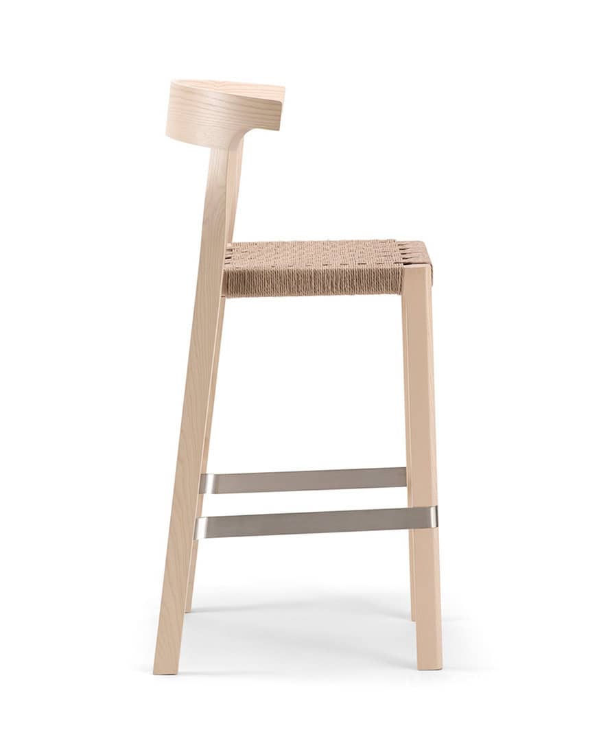 The Torso high stool has an ash wooden frame available in various factory stains, with a chrome footplate.