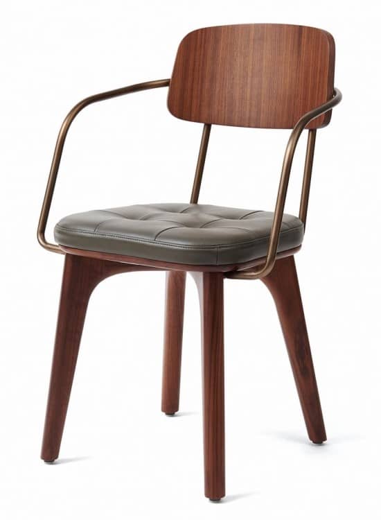 The Utility Armchair is made of Metal in Brass finish and Wood. Buttoned seat available to be upholstered in any Fabric, Faux Leather or Leather. Legs and plywood back available in various wood finishes.