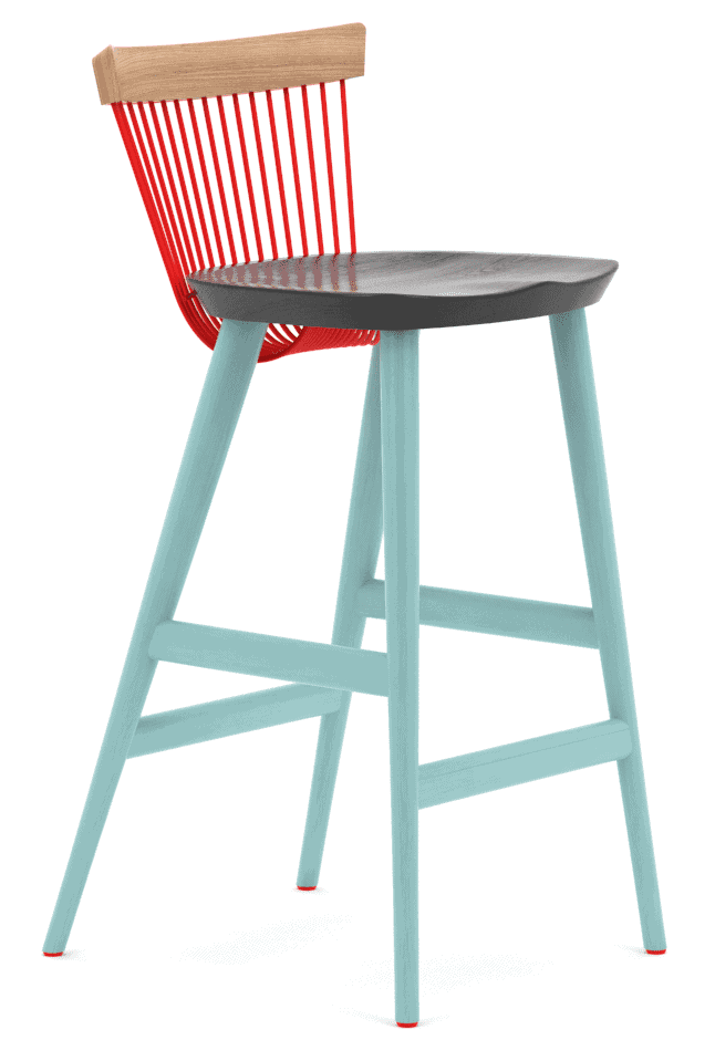 The WW. High Stool is inspired from the Traditional Windsor chair.Different finishes available in a natural oiled oak, walnut or black stained version, with either a black, red or white wire options.